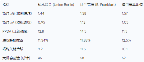 :柏林联合的 PPDA 值为 12.8,明显低于法兰克福的 14.5。在 PPDA 的逻辑中,数值越低代表压迫强度越大。这表明鲍姆加特的球队更倾向于在中前场进行高强度的绞杀,这与他们本赛季犯规数排名联赛前三的数据(267 次)完全吻合 。