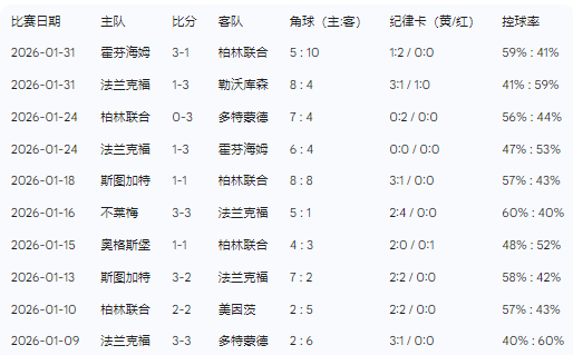 从上表可以看出,柏林联合在对阵控球型球队(如多特蒙德、霍芬海姆)时,即使控球率落后,也能创造出可观的角球机会(单场曾达 10-11 个),这反映了其战术中极高的长传比例和边路传中倾向 。法兰克福的比赛则呈现出典型的“互捅局”特征,近 6 场联赛均能进球但也均有失球,且全部打出 Over 2.5(总进球数大于 2.5) 。