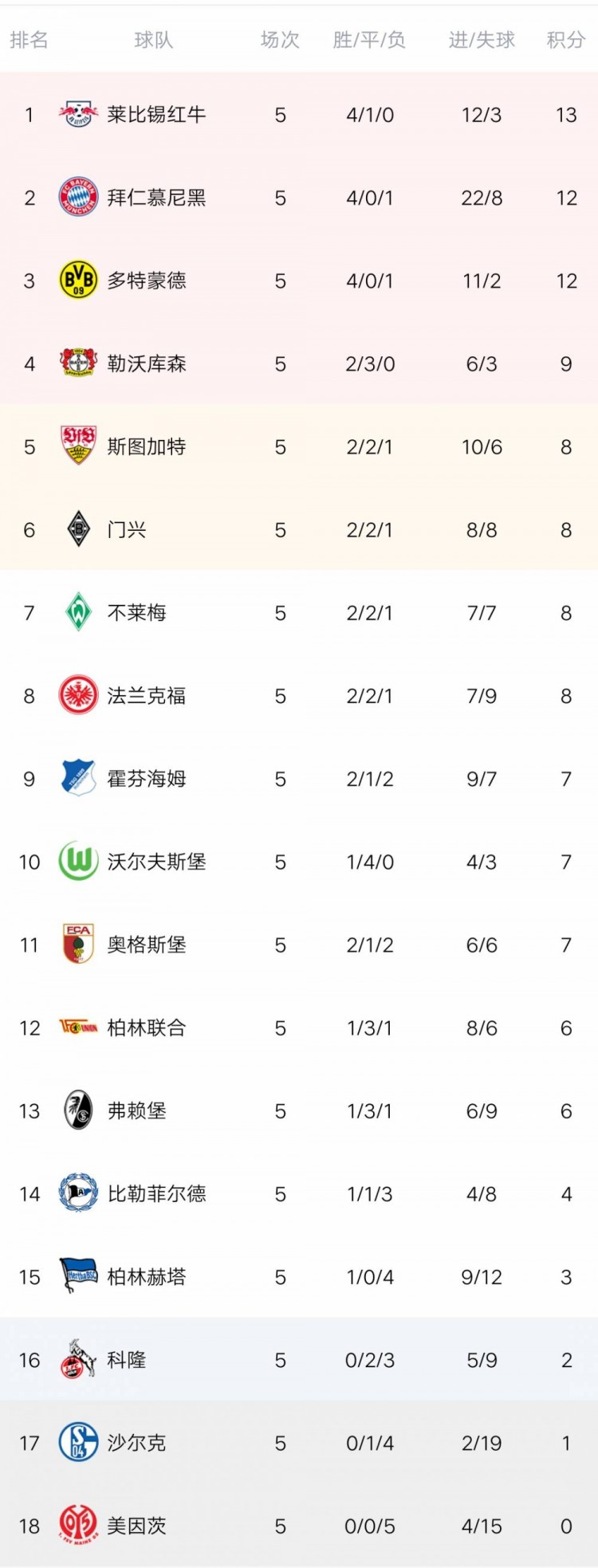 莱比锡以13分位居榜首,拜仁和多特同积12分紧随其后,勒沃库森积9分排名第四,斯图加特、门兴、不莱梅和法兰克福积8分。