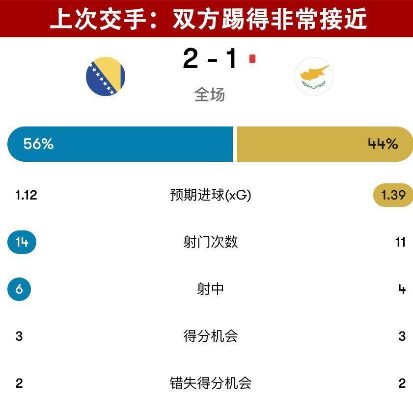 两队历史交锋也挺有意思。一共交手5次,全部决出了胜负,塞浦路斯2胜3负稍处下风。最近一次就是本届世预赛的第二比赛日,当时塞浦路斯客场1:2小负波黑。在主场对阵波黑的比赛中,塞浦路斯战绩为1胜1负,两次比赛的分差都是1球,说明两队打起来实力差距并不大。