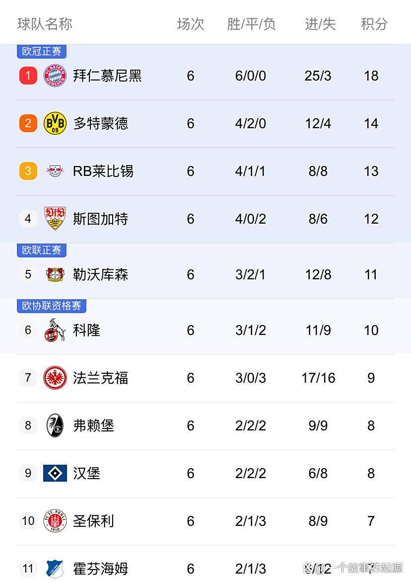 德甲积分榜呈现明显分层:拜仁6战全胜积18分独占鳌头;多特蒙德4胜2平积14分紧随其后;RB莱比锡(13分)、斯图加特(12分)和勒沃库森(11分)组成争冠第二梯队。