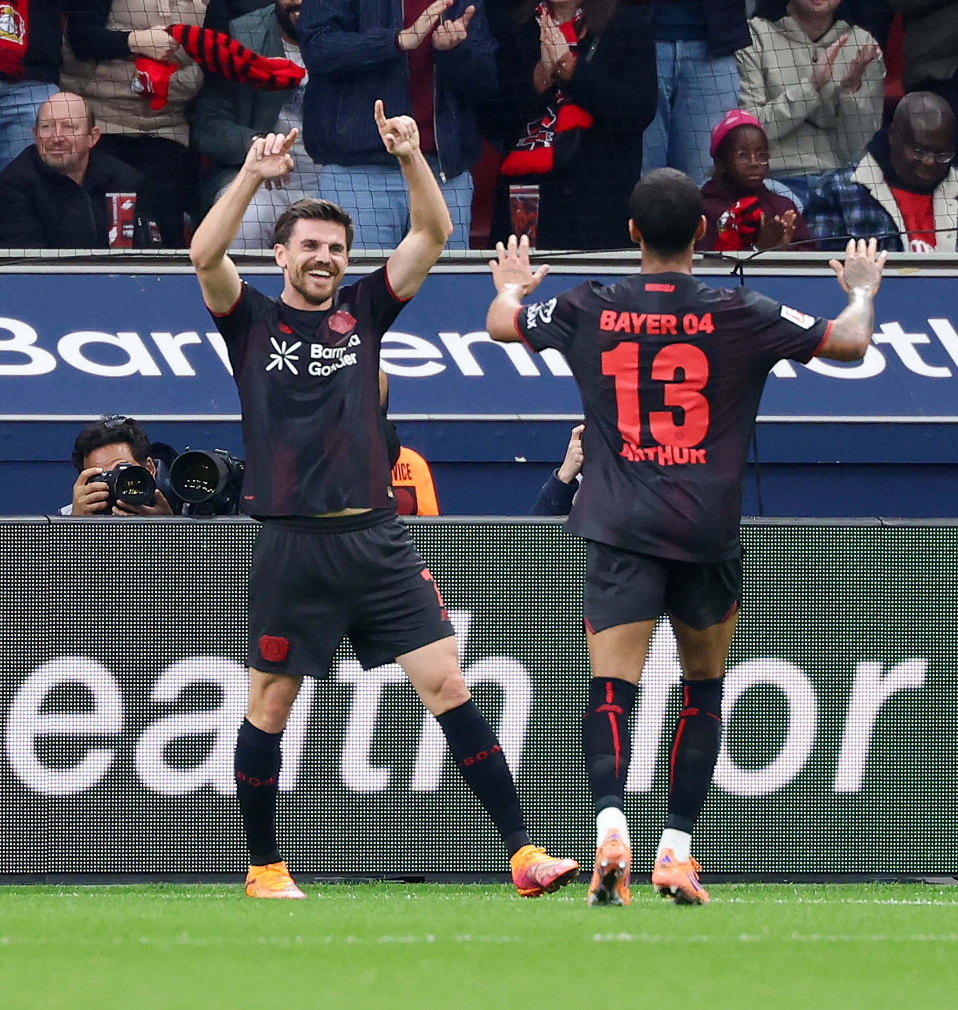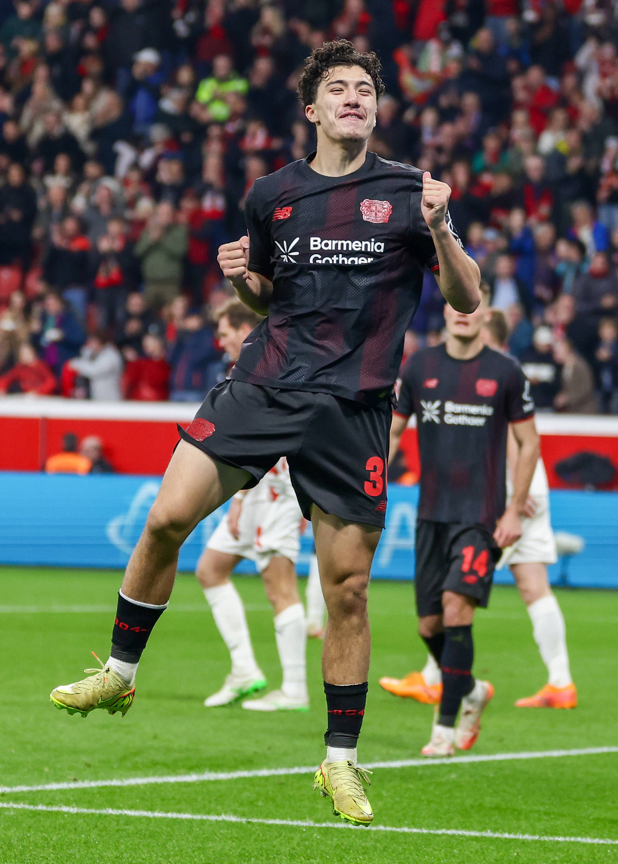 11月8日,勒沃库森队球员马扎庆祝得分。 新华社发(约阿希姆·毕瓦勒兹摄)