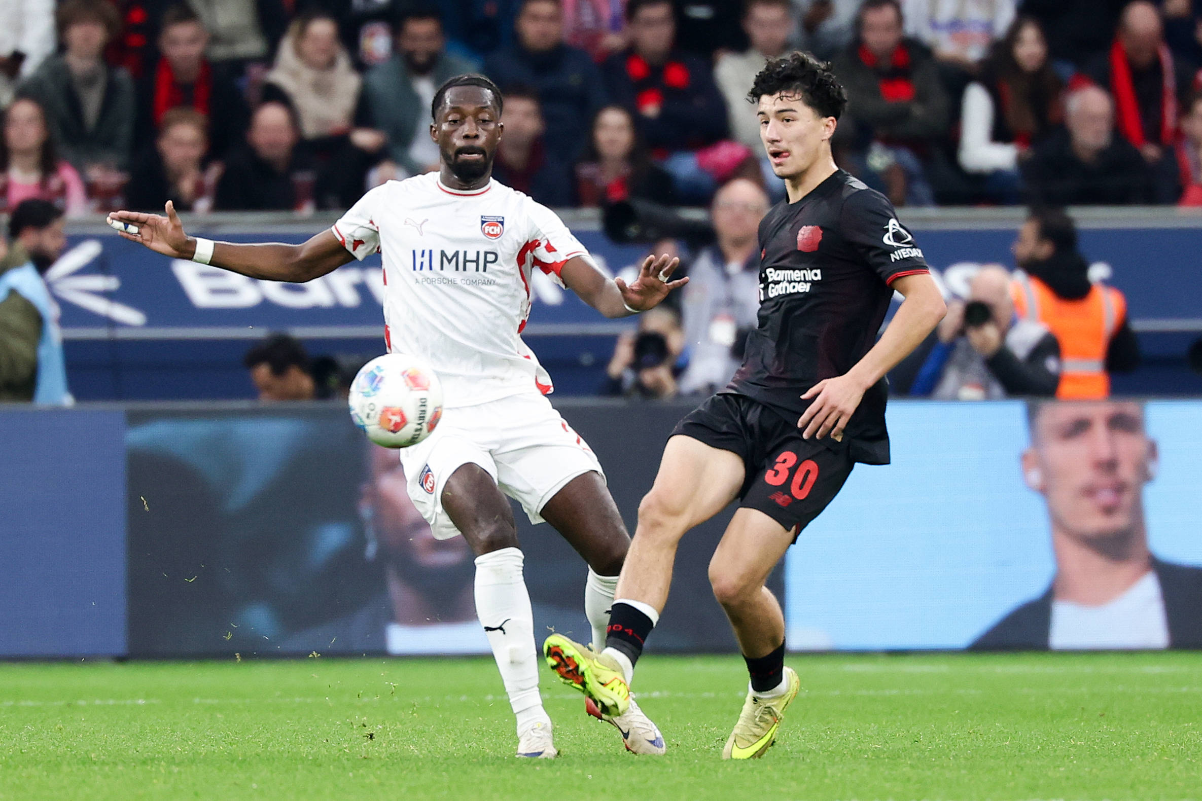 11月8日,勒沃库森队球员马扎(右)和海登海姆队球员特拉奥雷在比赛中拼抢。 新华社发(约阿希姆·毕瓦勒兹摄)