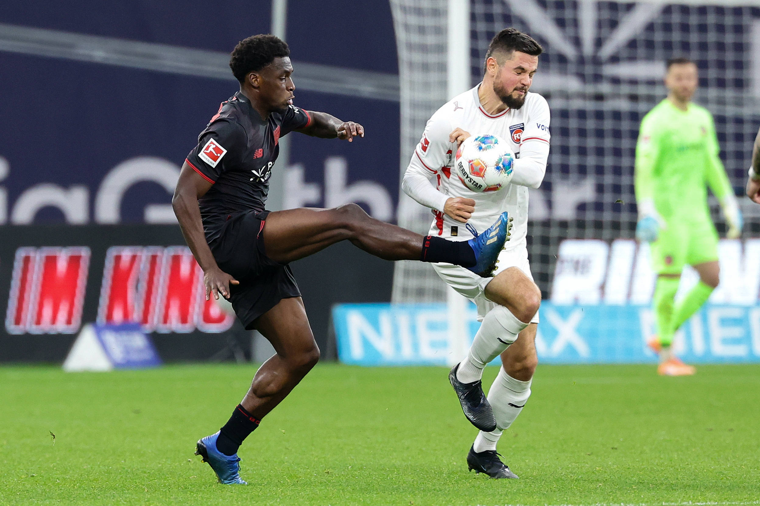 11月8日,勒沃库森队球员安德里希(右)和海登海姆队球员舍普纳在比赛中拼抢。 新华社发(约阿希姆·毕瓦勒兹摄)