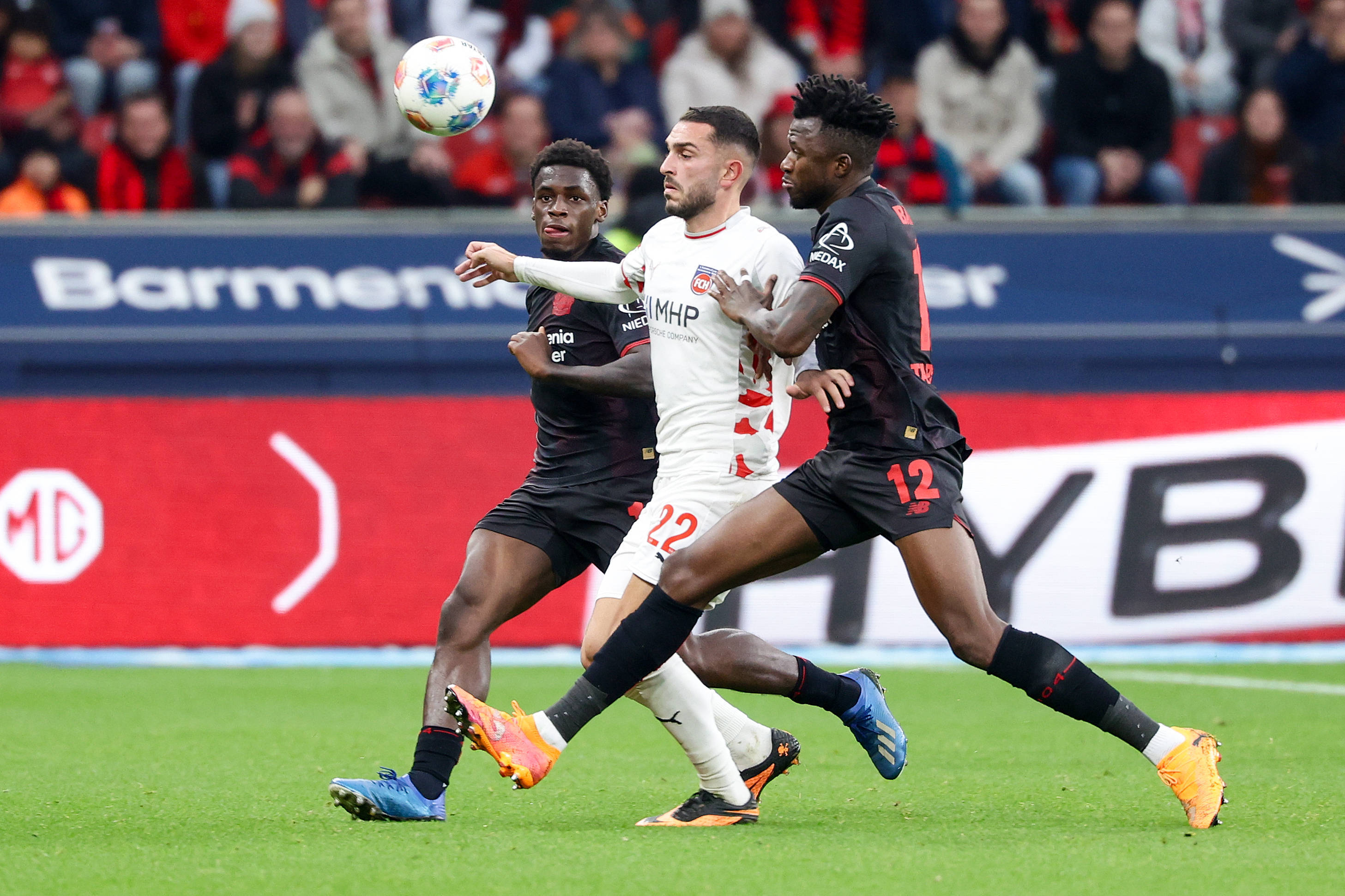 11月8日,勒沃库森队球员塔普索巴(右)、波库(左)和海登海姆队球员易卜拉希莫维奇在比赛中拼抢。 新华社发(约阿希姆·毕瓦勒兹摄)