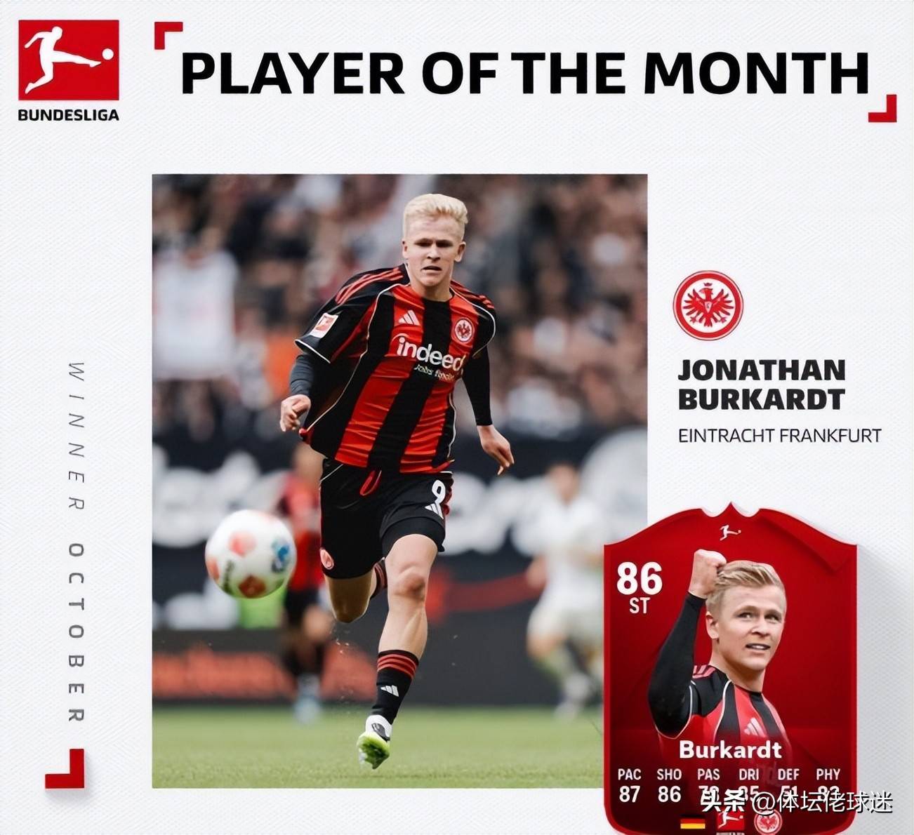得益于伯卡特近期的优异表现,德甲官方也在昨日宣布,他被评为10月最佳球员。在10月的三场德甲比赛中,法兰克福的成绩为1胜1平1负,而伯卡特独自打进了球队所有的4个进球。