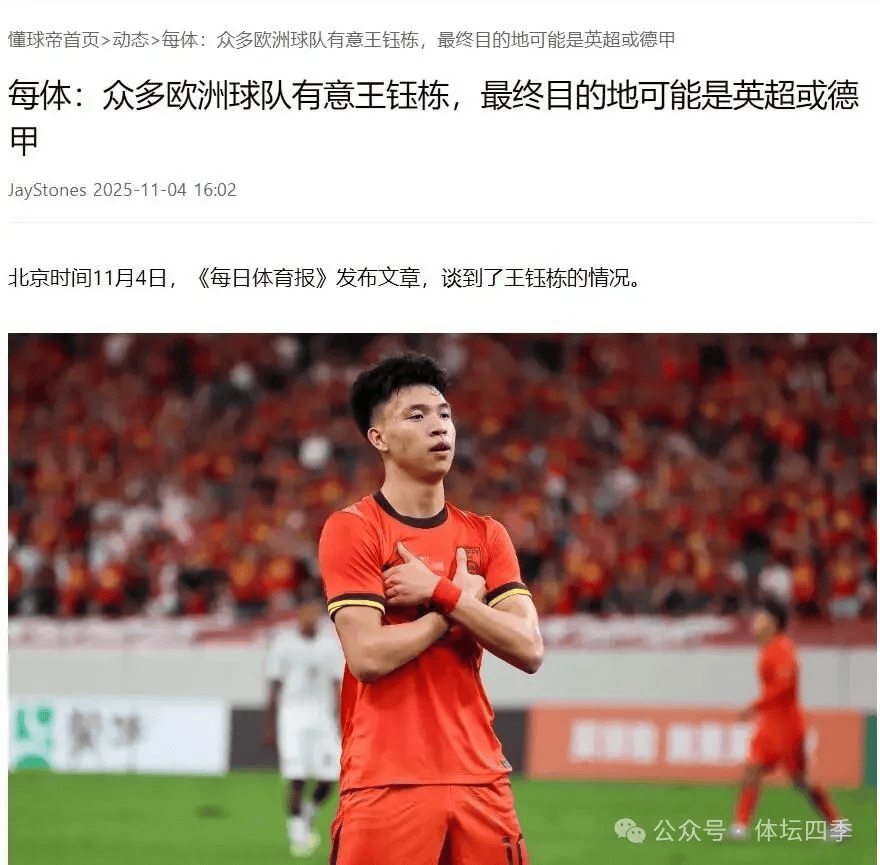 现在,外媒报道德国球队达姆施塔特98有意引进18岁的中国球员王钰栋,还对其提出了报价,最快这个冬窗有望签约,但目前浙江队没有任何官方回应。