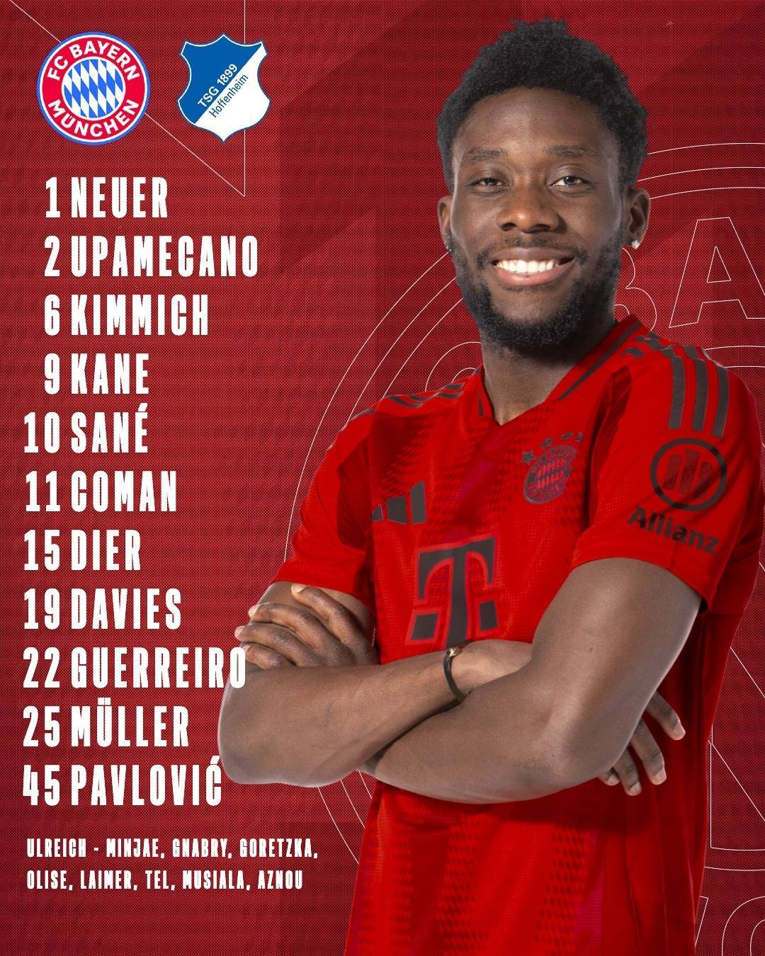 拜仁首发:1-诺伊尔、22-格雷罗、2-于帕梅卡诺、15-戴尔、19-阿方索-戴维斯、6-基米希、45-帕夫洛维奇、25-托马斯-穆勒、10-萨内、11-科曼、9-凯恩