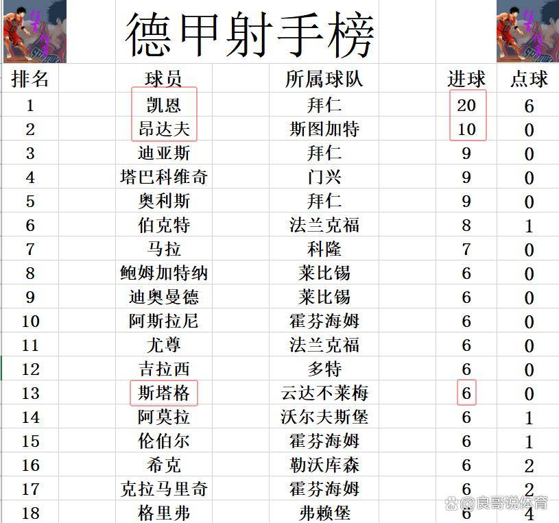 在射手榜上,凯恩以20球遥遥领先,昂达夫以10球位居第二,迪亚斯、塔巴科维奇和奥利斯以9球并列第三。不莱梅的斯塔格凭借本场比赛的进球,以6球的成绩跻身前十。