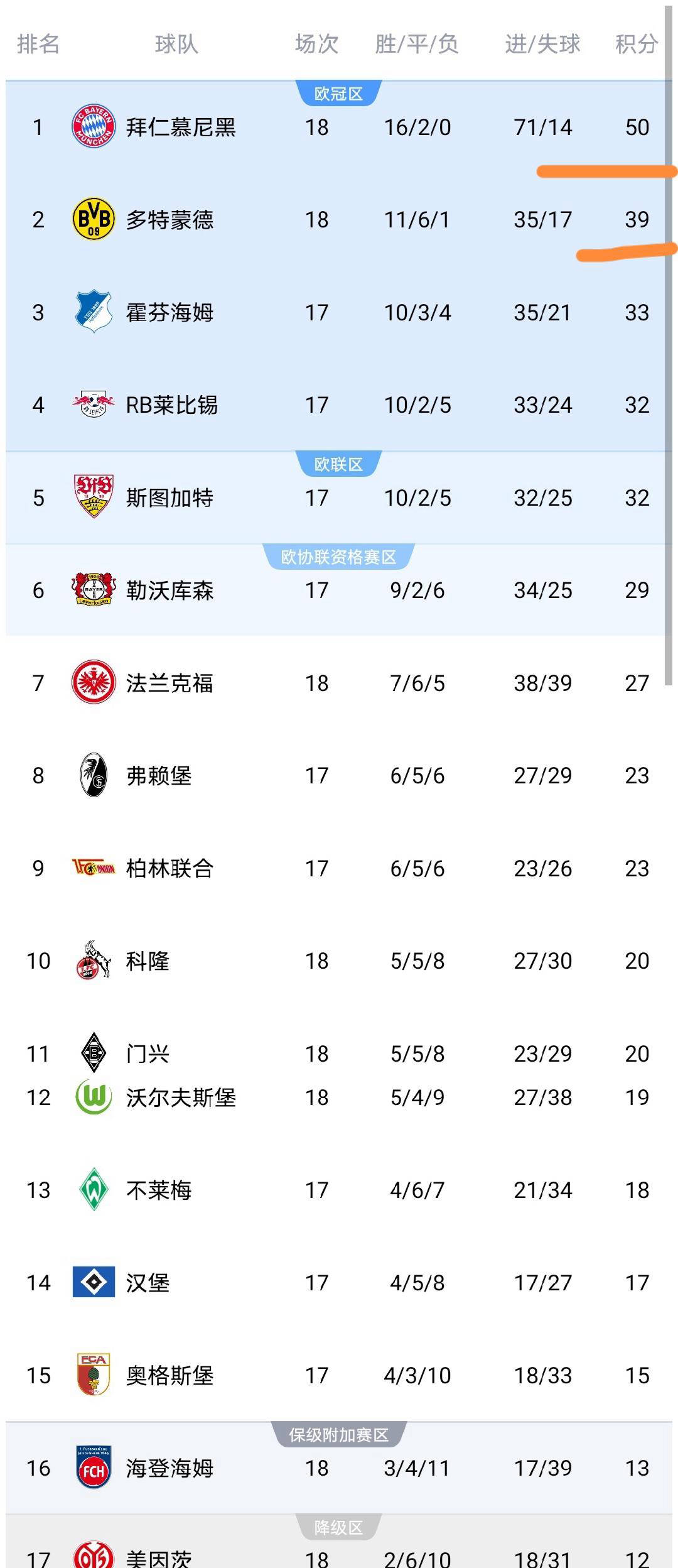 其他场次,勒沃库森则遗憾地以0-1不敌霍芬海姆,而美因茨也以1-2负于科隆。海登海姆与沃尔夫斯堡战成1-1平局,门兴格拉德巴赫在汉堡身上收获一场无进球平局。