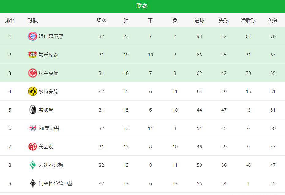 随着比赛尘埃落定,积分榜也迎来了新的格局。拜仁继续领跑,积分76分稳坐榜首,紧随其后的是勒沃库森,积分67分。法兰克福排名第三,拥有55分,为欧战席位探路。而多特蒙德凭借本轮胜利,累计51分,与弗赖堡并列第四,但凭借净胜球优势占据欧冠资格位置。莱比锡以50分位居第六,欧冠争夺战愈发激烈,从第4到第6名仅差5分,竞争异常白热化。未来的比赛,势必会让德甲联赛更加充满悬念与期待。返回搜狐,查看更多